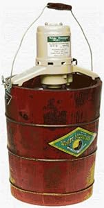 - Stainless-steel freezer can and dasher inside wooden tub